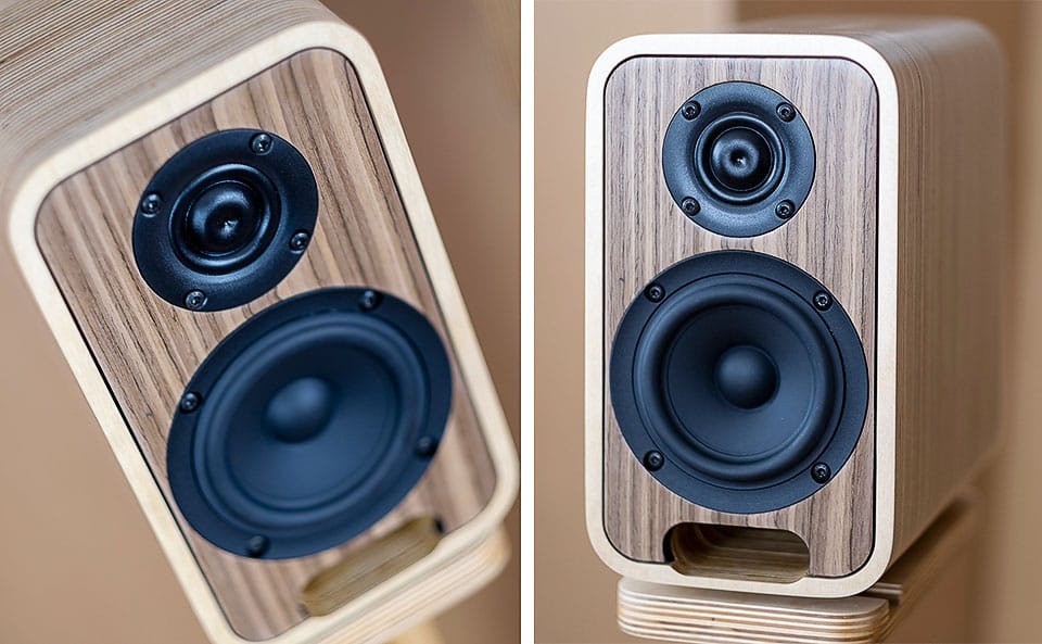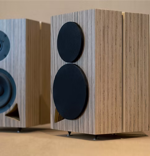 Colunas monitoras Cabasse Minorca MC40 com grelhas Pretas e Cinzentas em Light Oak